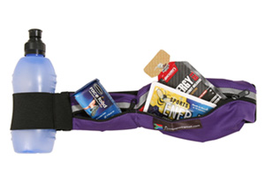 The elastic strap allows for expansion for different waist sizes. It closes with a moulded black plastic clasp. To give a size estimate, the small pocket fits at least 2 GU's, the larger pocket 6 GU's.